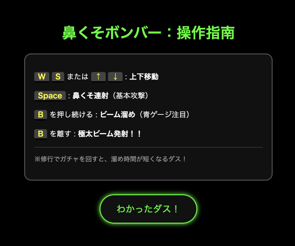 鼻くそボンバー(おすすめ) Posted On 2026年2月11日 「鼻くそボンバー」 敵に鼻くそを飛ばしてバトル‼︎ミニゲームのアスレチックで修行し色々な力をゲットせよ! アスレチックゲームとシューティングゲームを組み合わせた新感覚ゲームです。PCでの操作になります。 ゲームをはじめる 操作方法↓ Add a Comment コメントをキャンセルメールアドレスが公開されることはありません。 ※ が付いている欄は必須項目ですComment Δ